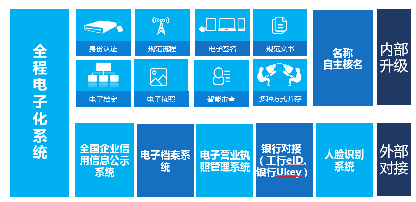在现有登记注册网上申请、受理等服务的基础上,根据全流程登记改革要求对登记业务流程进行优化,升级现有的工商综合业务管理平台、网上服务平台,实现以身份认证技术为信任支撑的网上申请、网上受理、网上审核、网上公示、网上发照、网上亮照、网上归档等全程电子化登记管理方式,为企业登记注册以及凭营业执照从事电子商务等相关经营活动给予更大地便利。