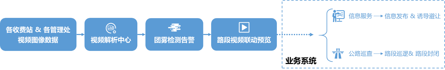 视频联网云平台顺利获得对路段视频数据进行气象事件解析及告警提示,同时联动相邻路段视频调阅预览,分析气象覆盖距离,将预警信息推送至业务系统中。业务系统启动恶劣气象应急处置预案: