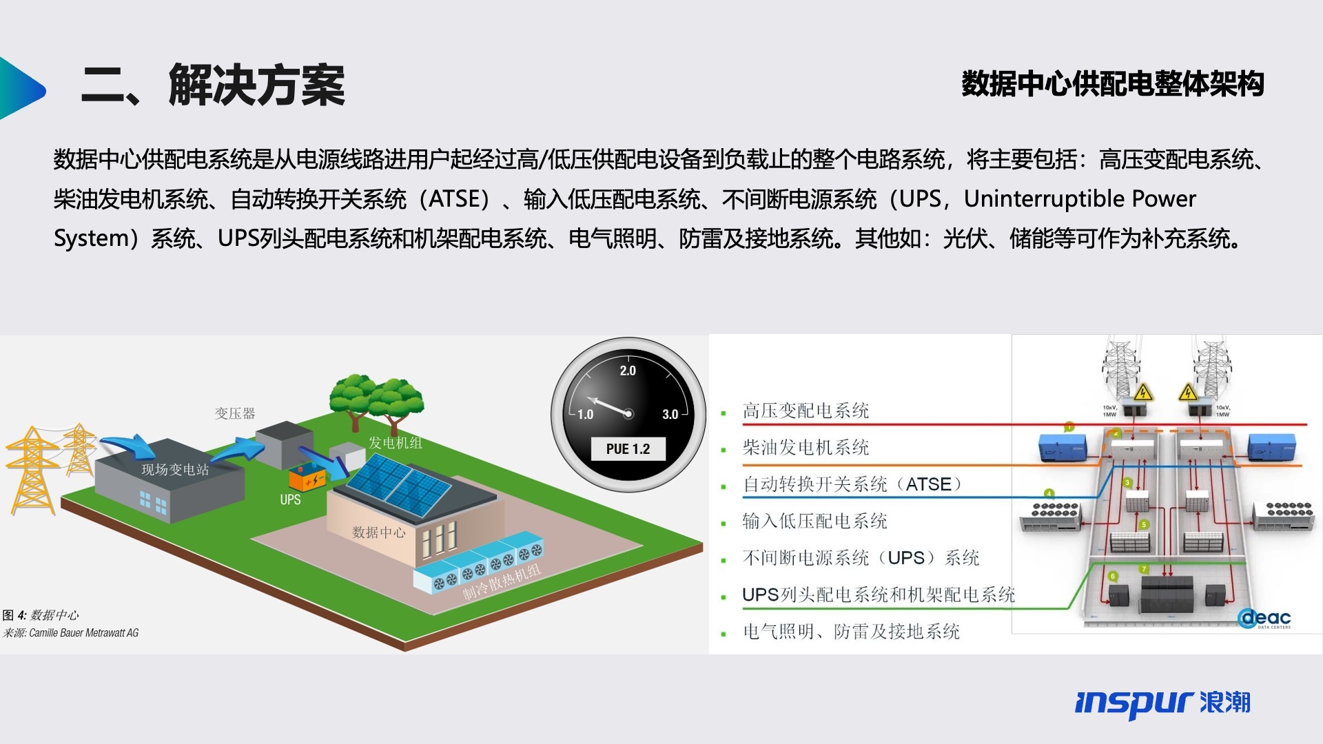 数据中心供配电系统是从电源线路进用户起经过高/低压供配电设备到负载止的整个电路系统,将主要包括:高压变配电系统、柴油发电机系统、自动转换开关系统(ATSE)、输入低压配电系统、不间断电源系统(UPS,Uninterruptible Power System)系统、UPS列头配电系统和机架配电系统、电气照明、防雷及接地系统。其他如:光伏、储能等可作为补充系统。