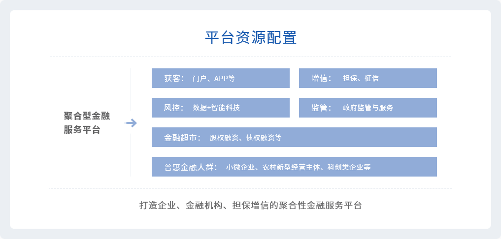 金融服务平台是为地方政府建设,在获取主体授权的基础上依托政府数据和AI风控建模技术,以“征信+增信”的手段有效降低金融组织服务中小微企业的信贷风险、提高服务意愿,最终达到缓解区域内企业贷款难、贷款贵问题,当前平台已累计在济南、青岛、无锡、聊城等26个城市落地运营。借助政府公共服务资源,将获客通道、金融超市、政府大数据、增信政策、财政政策等有机整合,构建面向全领域企业的普惠金融基础信息设施。
